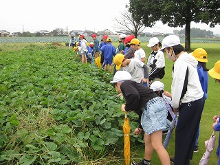 1学期に植えたさつまいもの苗の観察に行きました。植えた時は、葉が2枚くらいの苗を植えましたが、下の土が見えなくなるくらい大きく育っていました。葉の大きさと手の大きさを比べて「自分の手より大きかった」とびっくりしていました。来週のさつまいも掘りが楽しみです。
