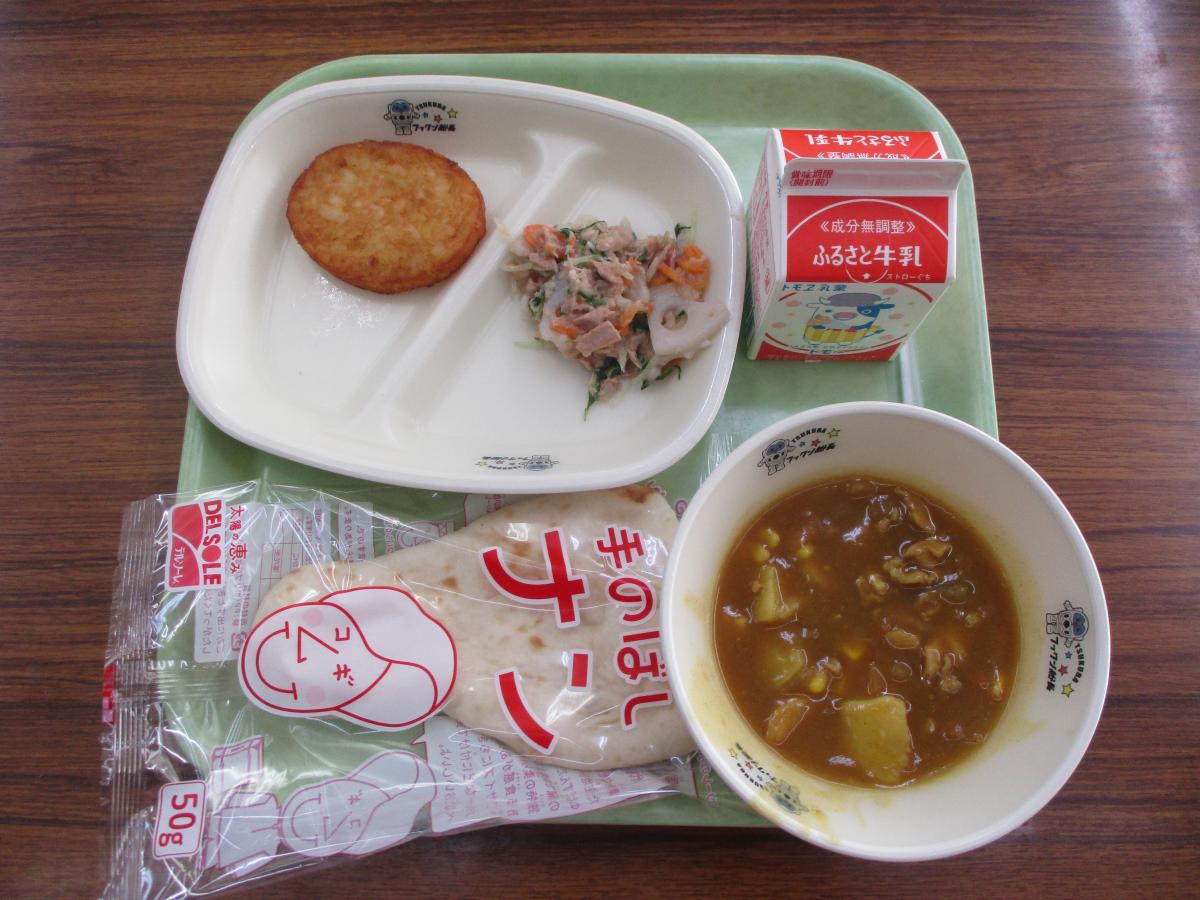 今日の給食は、ナン、牛乳、ハッシュドポテト、みずなのサラダ、チキンカレーでした。