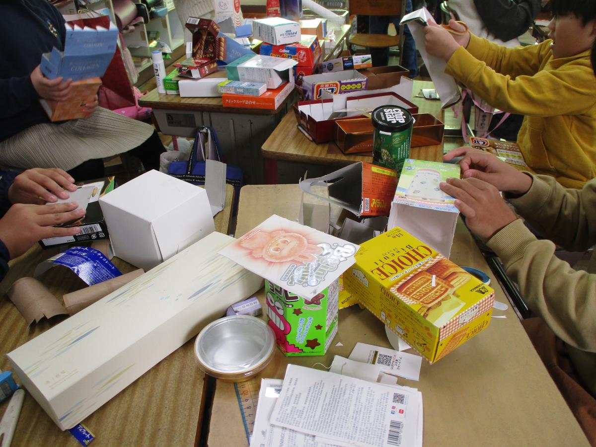 図工の学習では、家から持ってきた様々な箱を使って工作をしています。丸や四角に切ったり、切った箱を組み合わせたりして、変身させています。来週も続けて行う予定です。どんな作品ができるか楽しみですね。