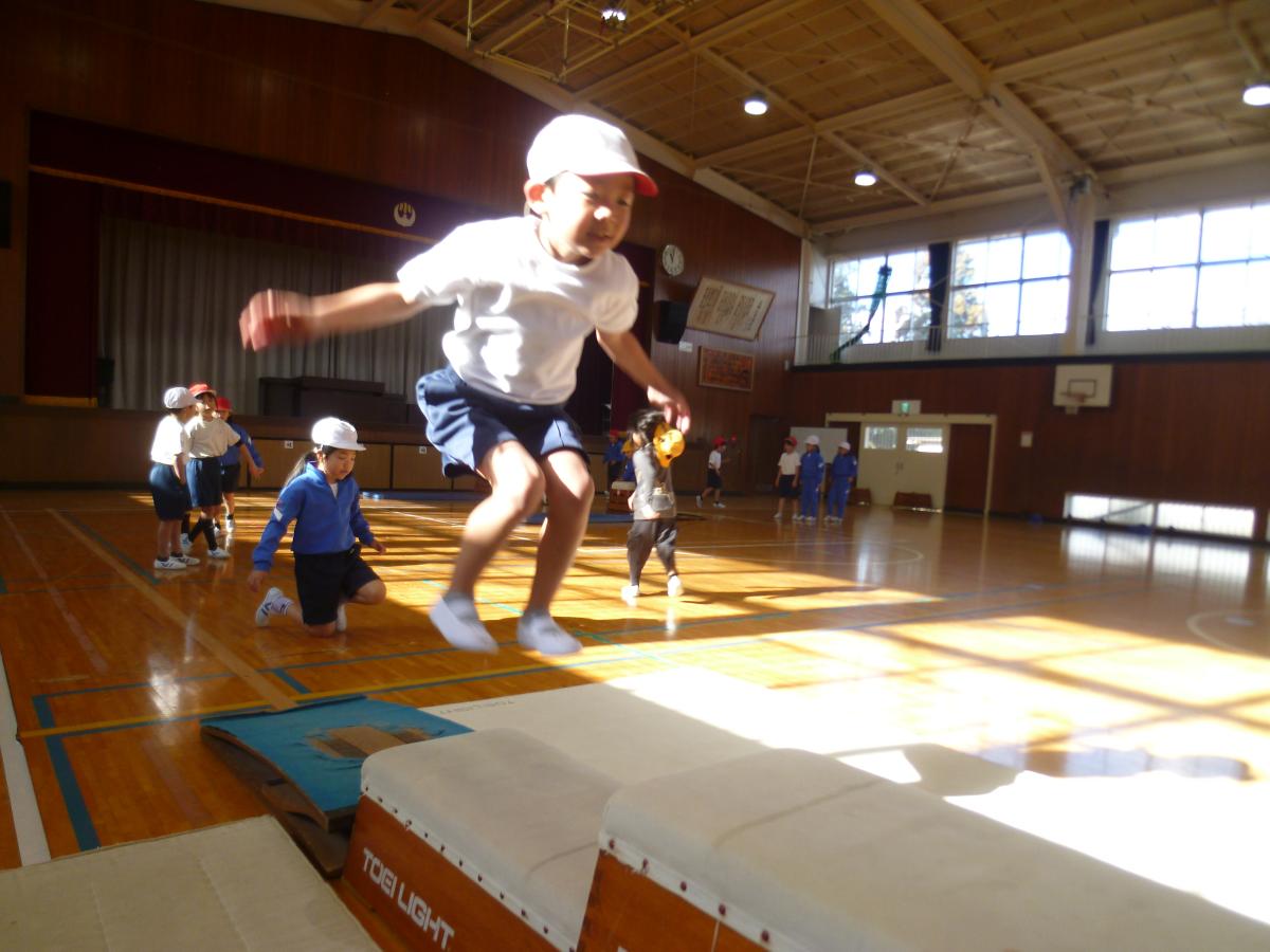 体育の授業で、とびばこあそびをしました。階段状のとびばこを、ウサギ跳びやカエル跳びで跳んだり、決まったところに両足でしっかり着地する“ピタッとチャレンジ”に挑戦したりしました。寒さに負けず元気に楽しく活用することができました。