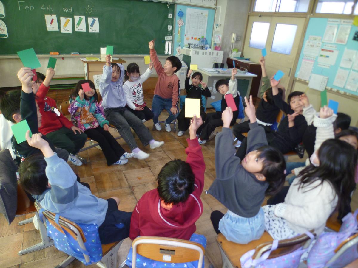外国語活動で、色の表現のしかたを学習しました。発音の練習をし、授業の後半には、色カードを使ってフルーツバスケットゲームを行いました。「わたしは○○色だよ!」「何色かな?どきどきするな。」などと言い、楽しく遊びながら外国語の表現に親しみました。
