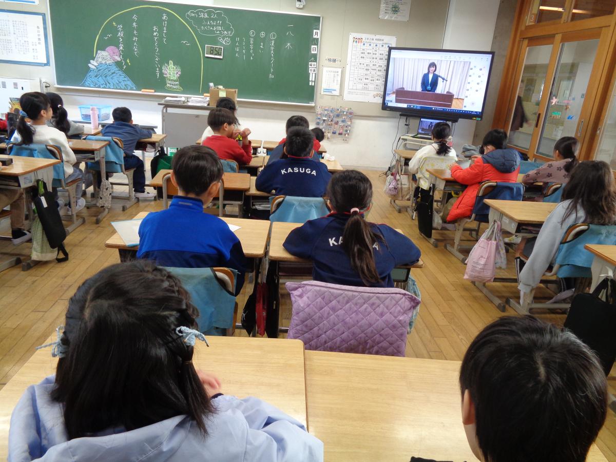 集会の様子は各教室に配信され、子供たちは各教室で映像を見ました。