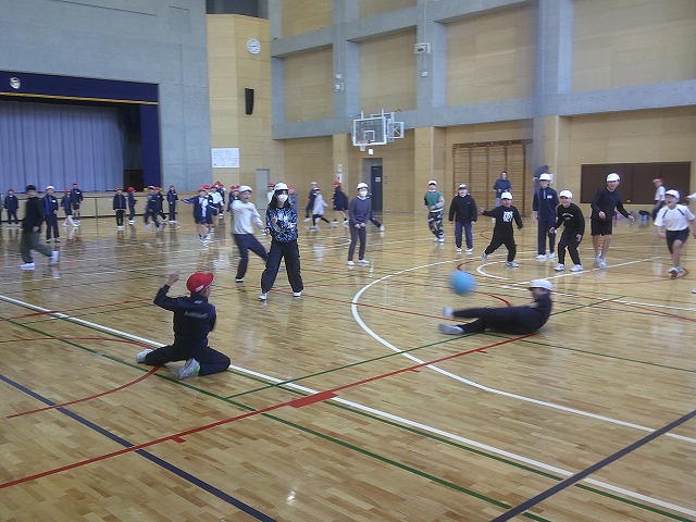 継志式(卒業証書授与式)の準備で小学校の体育館が使えないため、この日は中学校の体育館をお借りして、3年生と5年生がドッジボールの対決を行いました。