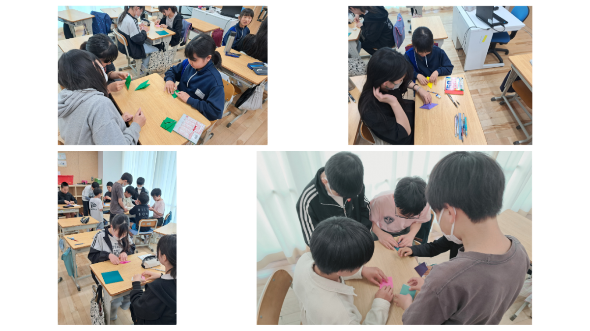 4人の児童の休み時間の言動から、本日の道徳の授業で「原爆の子の像」をつくるきっかけとなった佐々木禎子さんについて学習しました。その中で6年1組では「平和への願い」を込め千羽鶴を作り、広島平和記念公園に届けようというプロジェクトがはじまりました。折り紙の裏に平和への願いや12歳で亡くなった佐々木禎子さんへのメッセージを書いて鶴にしている児童もいました。