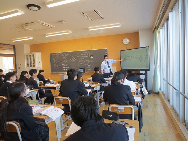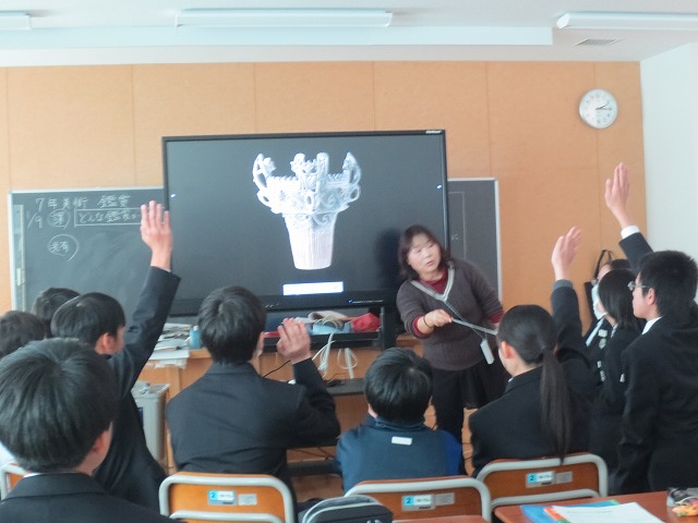 今日の美術の授業では対話型鑑賞に取り組んでいました。先生の解説を一方的に聞くのではなく、生徒自身が主体的に発言をし、対話をしながら美術作品に対する見方や価値意識を深めていくというものです。3つのグループに分かれて、作品を鑑賞しての気付きや感想を述べ合っていました。気付きや感想に正解はないので感じたことをのびのびと話す姿が印象的でした。※「カテゴリー 学校からのお知らせ」をクリックしていただきますと、掲載されている他の写真もご覧になれます。
