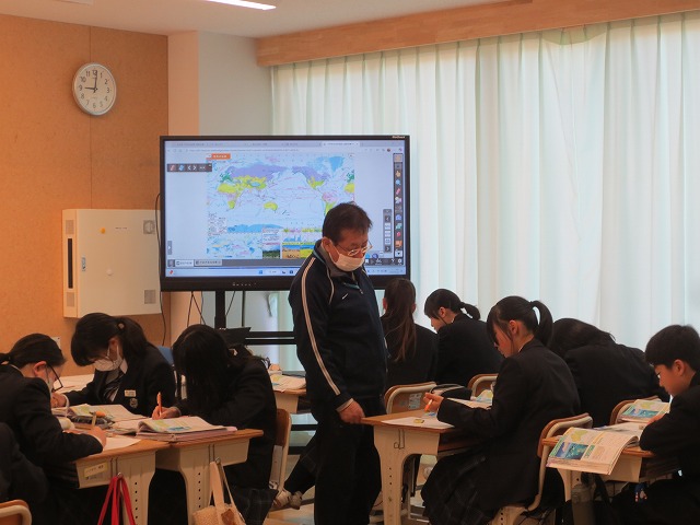 8年生の社会の授業の様子です。オセアニア州の自然環境について、地形や気候をもとにどのような特徴があるか調べていました。