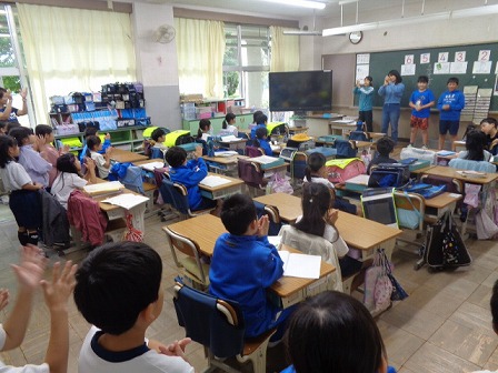 小学校初めての運動会を迎える1年生に、朝の会の時間を利用して応援団の5、6年生が応援の振り付けなどを教えに来てくれました。一つ一つていねいに教えてくれたので、1年生もすぐに覚えたようです。短い時間はあっという間に過ぎ、応援団員が練習の終わりを告げると、もっとやりたい!といった声が聞こえました。