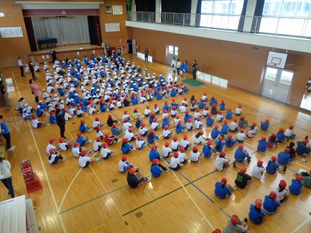 あいにくの天候で体育館で行うことになった全体練習。しかし、子どもたちのモチベーションは落ちていません。今日は開会式の流れを確認します。真剣な表情でお辞儀のタイミングなどを確認、運動会の歌は各教室で練習した成果を発揮していました。応援合戦も初めてとは思えないほど、息があった演技でした。当日が楽しみです。