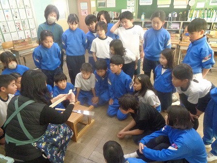 図工でのこぎりを初めて使います。のこぎりの使い方について、先生からの説明を真剣な目で聞いています。その後、友達に押えてもらいながら交代で木片を切っていました。けがをすることなく思い思いの長さに切りだすことができました。