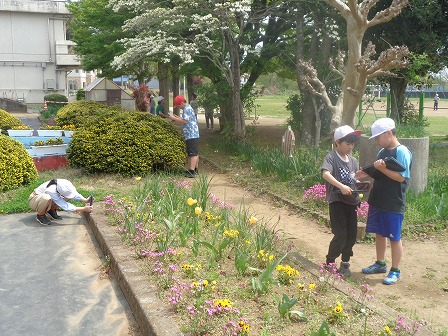 業間休みのプールに何やら人影が・・・・。5年生がヤゴ救出作戦を決行していました!プール清掃で水を抜く前に一人一匹は捕まえ、羽化するまで育てます。中には4匹も捕まえている子もいました。また、一回り大きいヤゴを見つけた子は「オニヤンマかな?」と期待を寄せていました。みんなと同じように無事成長することを祈ります。