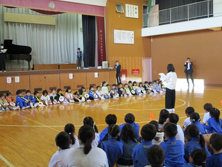 6年生に連れられて入場して来た時は少し恥ずかしそうな表情だった1年生も、2年生からプレゼントをもらってからは笑顔になりました。学校紹介を兼ねた○×クイズや「じゃんけん列車」では学年関係なく楽しむことができました。これからも全校で一つとなって九重小での生活を楽しくしてほしいと思います。