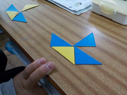 1年生は色板を移動させ、いろいろな形を作り平面図形の構成を考えていました。
