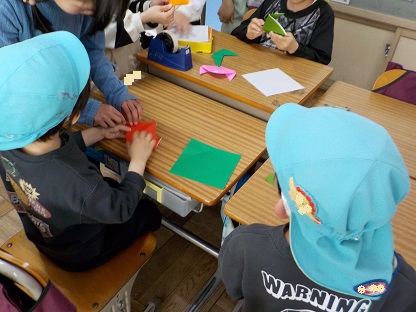 今日は、4月に入学予定の園児が来校し、1年生がお兄さんお姉さんとして小学校の学習の一端を紹介したり、折り紙やタブレットを使ったお絵描きを一緒に行ったりしました。