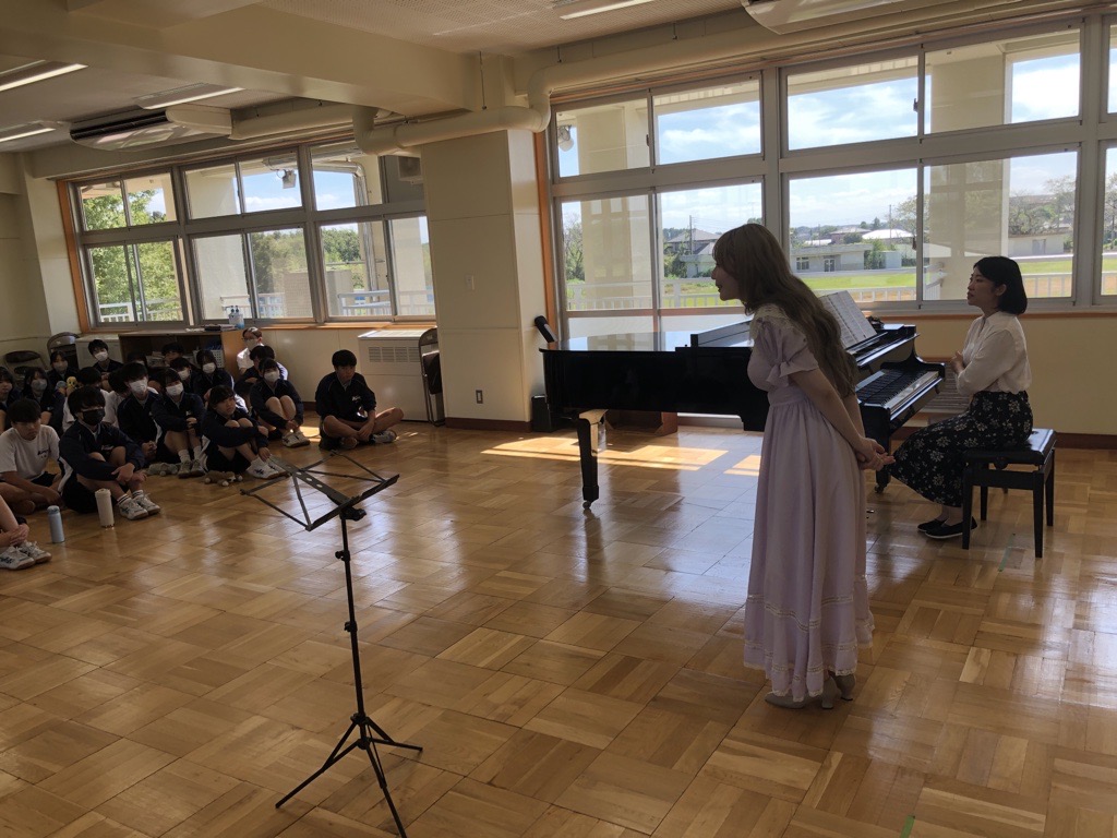 明日は、稲穂祭、合唱コンクールが開かれます。前日ではありますが、3校時に各学年1組、4校時に各学年2組の生徒を対象に「芸術鑑賞会」が開かれました。講師として梅津 碧(うめつ みどり)先生、清水 史(しみず ふみ)先生に来校いただきました。20分間の声楽コンサートでは、グノー作曲『ロメオとジュリエット』よりジュリエットのアリア「私は夢に生きたい」、モーツァルト作曲『魔笛』より夜の女王のアリア「復讐の炎は地獄のように我が心に燃え」、アダン作曲『モーツァルトの主題による華麗なる変奏曲 (きらきら星変奏曲) 』を聴くことができました。プロの声楽に圧倒されている生徒がほとんどでした。