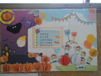10月の給食メニュー掲示板です。大玉を転がすにこにこ顔の子どもたち。10月25日の運動会に向けて気持ちも高まります。今日の献立は、やきそばとたこやき。縁日みたいです♪