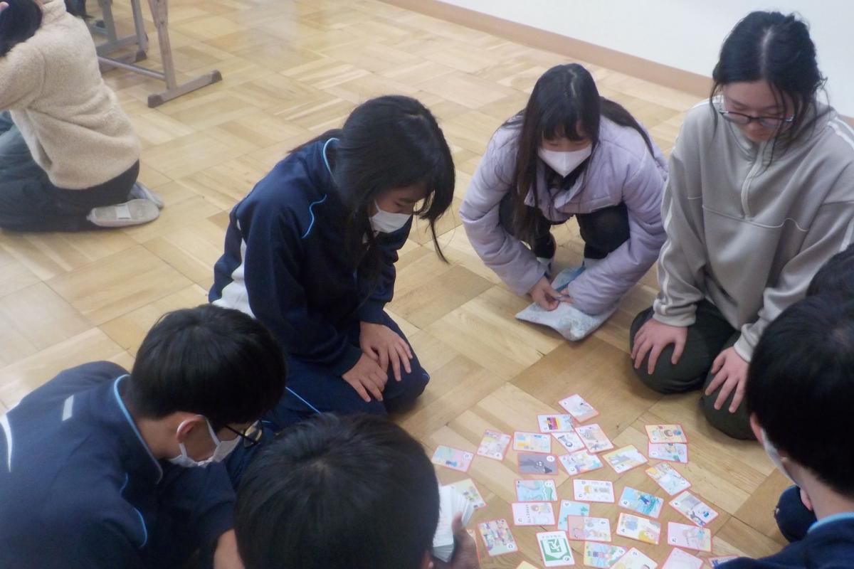 6年生が茎崎中学校へ行って、中学校の体験をしてきました。教室を案内してもらったり、学校生活の説明を聞いたりしました。9年生と一緒に防災カルタも楽しみました。