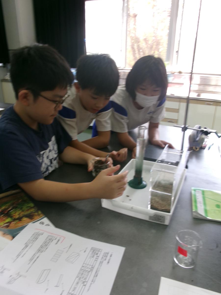 理科の学習では、地層のでき方について考えました。水や風の働きで地層が作られるという予想をもち、実際に堆積実験を行いました。大きくて重い「れき」が先に沈み、小さくて軽い「どろ」は一番最後にゆっくり堆積していく様子を観察しました。自分たちの考えを確かなものにしようと、何度も実験をくりかえし、砂が堆積していく様子を確認する姿が見られました。