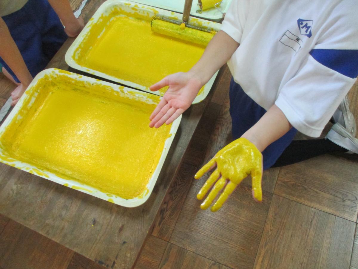 運動会の「南中ソーラン」で使う学級旗を作りました。5・6年生の各クラスで2枚ずつ作成です。1枚は「手形」、もう1枚は「メッセージ」で彩ることになりました。各クラスとも特色が出ています。見ているだけで、運動会へのみんなの気持ちが伝わってくるようでした。皆、わいわい言いながら楽しく作っていました。当日も楽しみにしていて下さい。