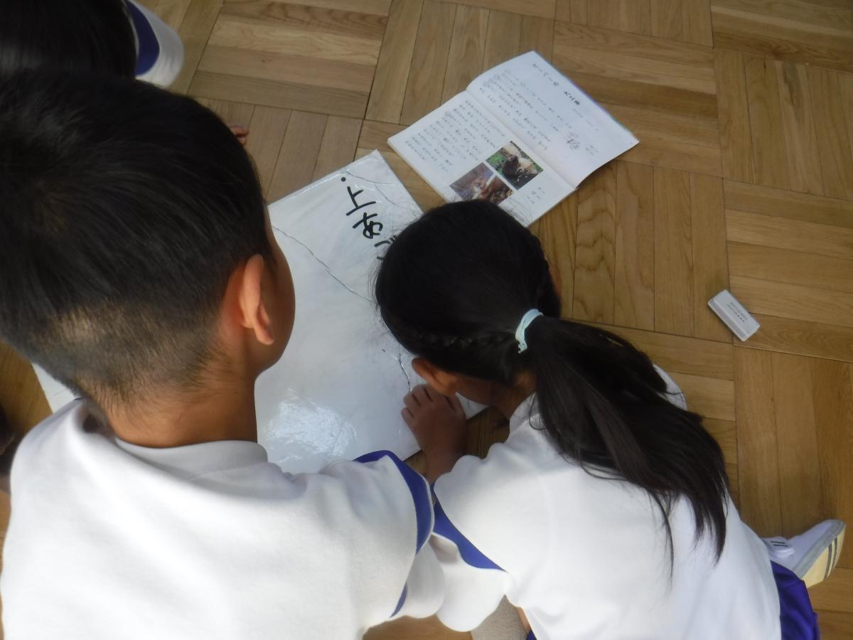 国語科「ビーバーの大工事」では、大事な言葉を見付けながら内容を読み取っています。今日は、ビーバーがどのようにして、木を切り倒すのか、その様子がわかる言葉をさがしました。グループで相談すると、自分が見つけていなかった言葉に気付きました。「たちまち」や「とびちる」などの言葉です。ビーバーがものすごい速さで木をかじっている様子が伝わる言葉だということがわかりました。さらに読みを深めていきます。
