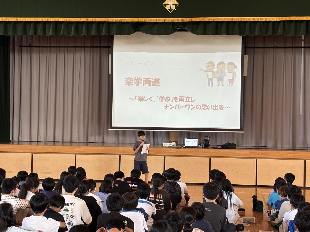 10月2,3日の修学旅行に向け、学年集会をしました。実行委員中心に準備を進め、当日の動きや、約束事などを確認しました。スローガンに込めた思いを聞き、気持ちを高めました。持ち物の準備はもちろんですが、体調管理も十分に気をつけて、当日を迎えてほしいです。