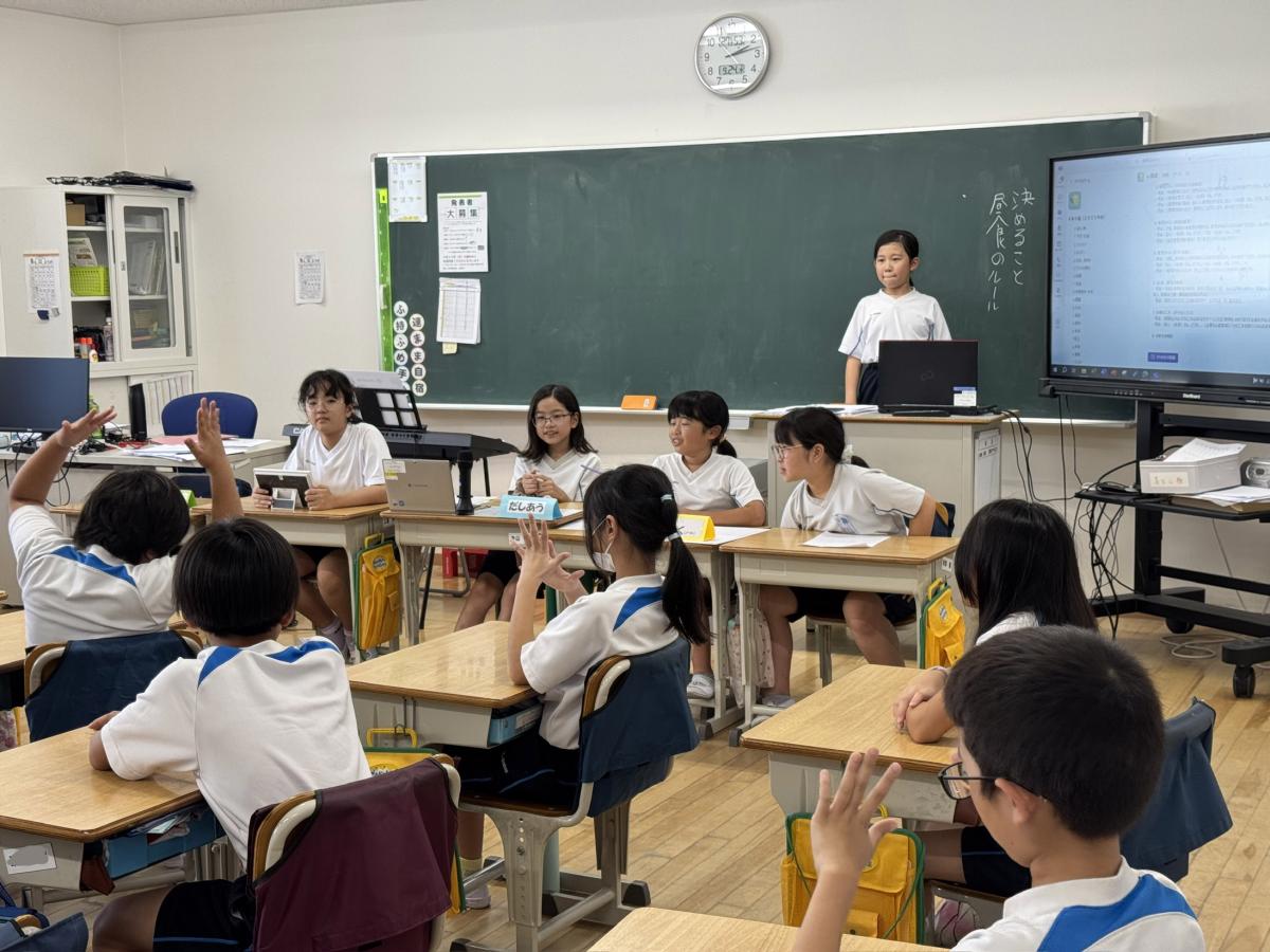 国語の学習では、学園生同士が意見を交わしながら話し合い活動に取り組んでいます。授業では、司会を中心に進行役・記録係などの役割を分担し、互いの考えを尊重しながら話し合いを進める姿が見られました。