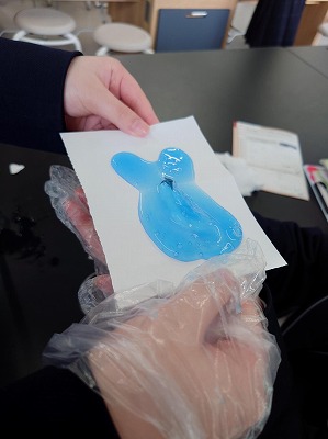 ねばりけの異なるスライムをマグマに見立ててモデル化し、噴火のようすと噴火後にできる山の形を観察しました。写真は、ねばりけの弱い火山のモデルです。