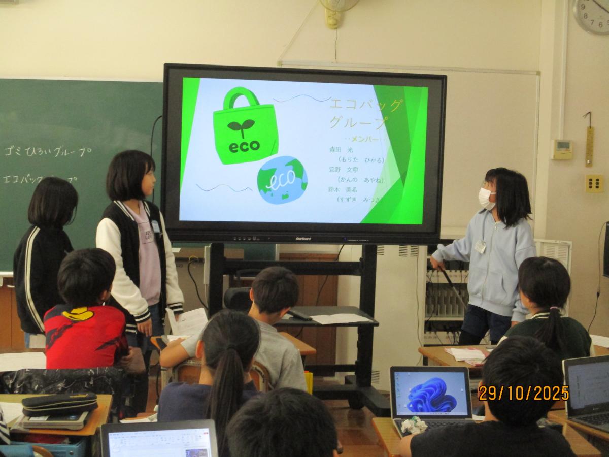 4月から今日にかけて。「エコ生活のすすめ~ごみを減らそう」というテーマについて調べ、グループごとに発表を行いました。コンポストやリサイクル、手前どり等のエコ活動を、模造紙やパワーポイントにまとめました。聞き手に伝わりやすい話し方、発表資料の作成を特に頑張りました。