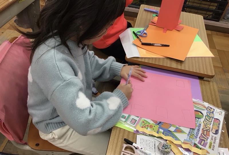 図画工作「まどのあるたてもの」の単元で、カラフルペーパーを使ってどんな建物を作ろうか設計を立てました。カッターナイフで切りたい場所を下書きをしました。どんな窓が切りやすいかを考えて形を考えていました。明日、実際にカッターナイフで切ります。上手に切れるか楽しみです。