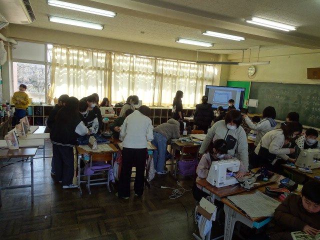 初めてのミシンに苦戦することも多いのですが、保護者ボランティアの方々にご協力いただき学習を進めています。