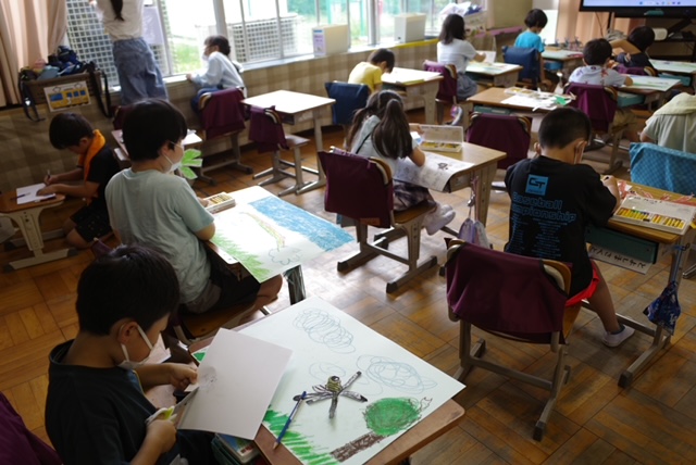 1年生が、想像力を働かせながら、楽しそうに絵を描いていました。トンボやカブトムシに乗って大空を飛びまわったり、虹の橋を友だちと一緒に渡ったり…、これまでの経験から豊かに想像を広げ、自分らしい 「できたらいいな」を絵で表現しています。1年生だからこその発想の豊かさで、教室中に夢があふれていました。