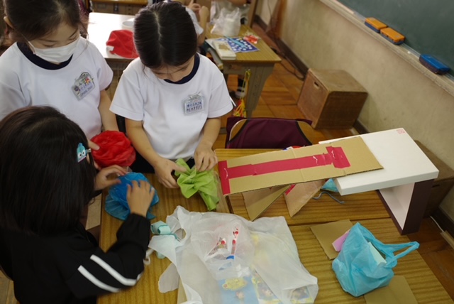 2年生が、図工でおもちゃ作りに取り組んでいます。いろいろな紙やゴム、コップやペットボトルなど、素材や材料の特徴を生かして作成しています。工夫したところを子供たち同士で紹介し合ったり、新たな遊び方を提案し合ったりしながら、オリジナルのおもちゃがたくさん生まれていました。