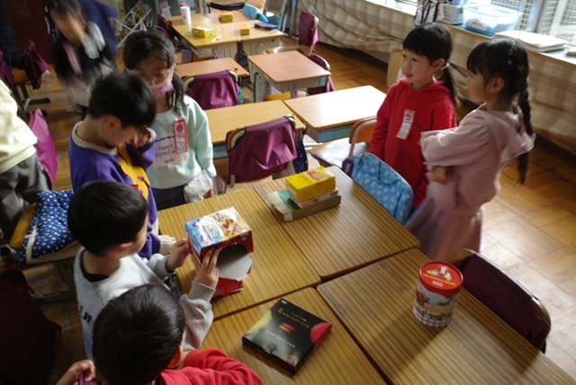 1年生は算数でいろいろなかたちについて学習しています。今日は、それぞれが用意した身の回りにある箱や筒などを、形に着目して仲間ごとに分類し、その理由を伝え合っていました。箱や筒を上から見たり、横から見たり、斜めから見たりと、様々な視点から一つ一つの立体の特徴をたくさん見つけることができました。