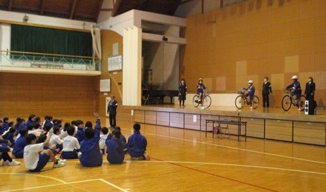 あいにくの雨となり、計画していたグラウンドでの実技を中心とした講習はできませんでしたが、体育館で動画を使った講義や、実際に自転車を使った安全確認などの講習を受けることができました。
