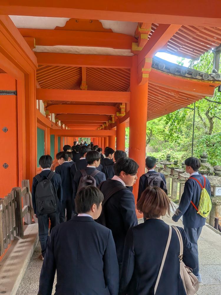 9年生の修学旅行での様子を紹介します。本日は、奈良方面の研修です。お昼ご飯を食べた後、春日大社を見学しました。朱塗りの社殿と多くの灯籠に、早速、感嘆の声が響いていました。また、藤の花も咲き始めていました。