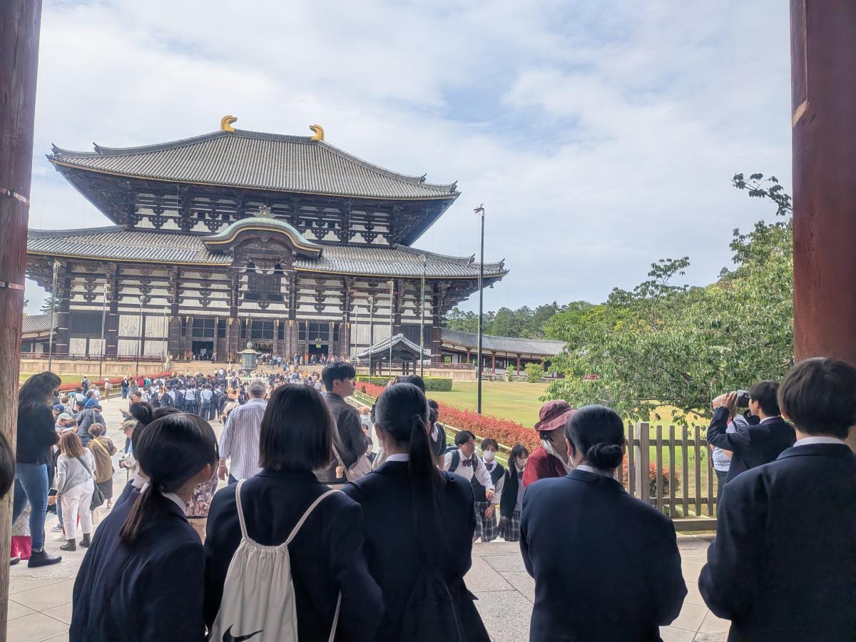続いて見学したのが、東大寺です。歴史の教科書でもおなじみの金剛力士像や、大仏を目にすると、想像よりも大きく、驚いている様子でした。また、奈良公園では鹿せんべいをあげるなど、自由時間をそれぞれ楽しみました。