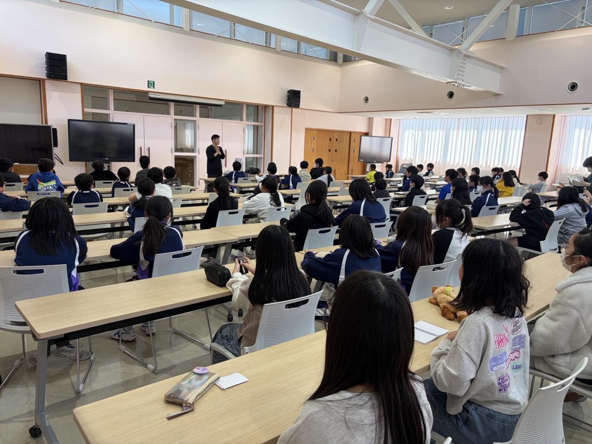 本日、昼休みに紫峰ホールにて、来年度の新登校班会議が実施されました。会議に参加した児童は、前期課程で来年度、それぞれの地区で新しく班長の役割を担います。徒歩通学の班長には、横断歩道の渡り方や歩き方を含めた通学路の確認を、バス通学での班長には車内のマナーについてなどを中心に話がありました。班長としての自覚を新たにした様子でした。