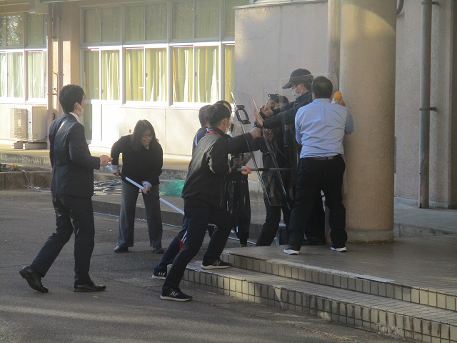 警察との連携の下、不審者対応のための避難訓練を行いました。警察の方に不審者役を依頼し、複数の教員で対峙する緊張感のある訓練となりました。また、生徒と担任は、教室でどのような動きをすればよいのか確認をし、真剣に訓練に取り組むことができていました。その後、警察の方から生徒に向けて、不審者対応はもちろんのこと、地震や津波についてや、非行防止についてなど、多岐にわたる内容で話をしていただきました。今後も不測の事態に対して、できる限りの備えをしていきます。