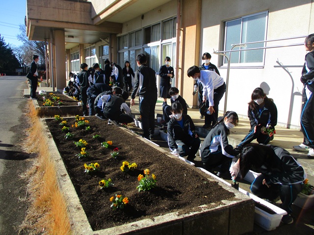 園芸委員の活動として、パンジーを植えている様子です。一つ一つ心を込めて植えました。今年度の卒業式で会場を彩る予定なので、大きく育つように欠かさず水やりをしていきたいと思います。チューリップの球根も植えています。立派に育ってほしいです。