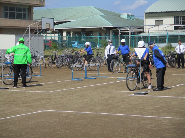 警察署の方や、市の防犯交通安全課の方などに来ていただき、自転車の乗り方を中心に、2時間の講習を受けました。生徒たちは真剣に話を聞き、校庭で実技講習も受けることができました。自転車は便利ですが、少しの油断や不注意で大きな事故にもつながるものです。今日学んだことを日々実践し、安全に自転車に乗ってほしいと思います。
