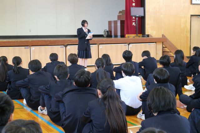 生徒会による学校生活についての説明があり、新しい学年を迎えるにあたっての心構えや学校のルールについて、分かりやすく紹介してくれました。