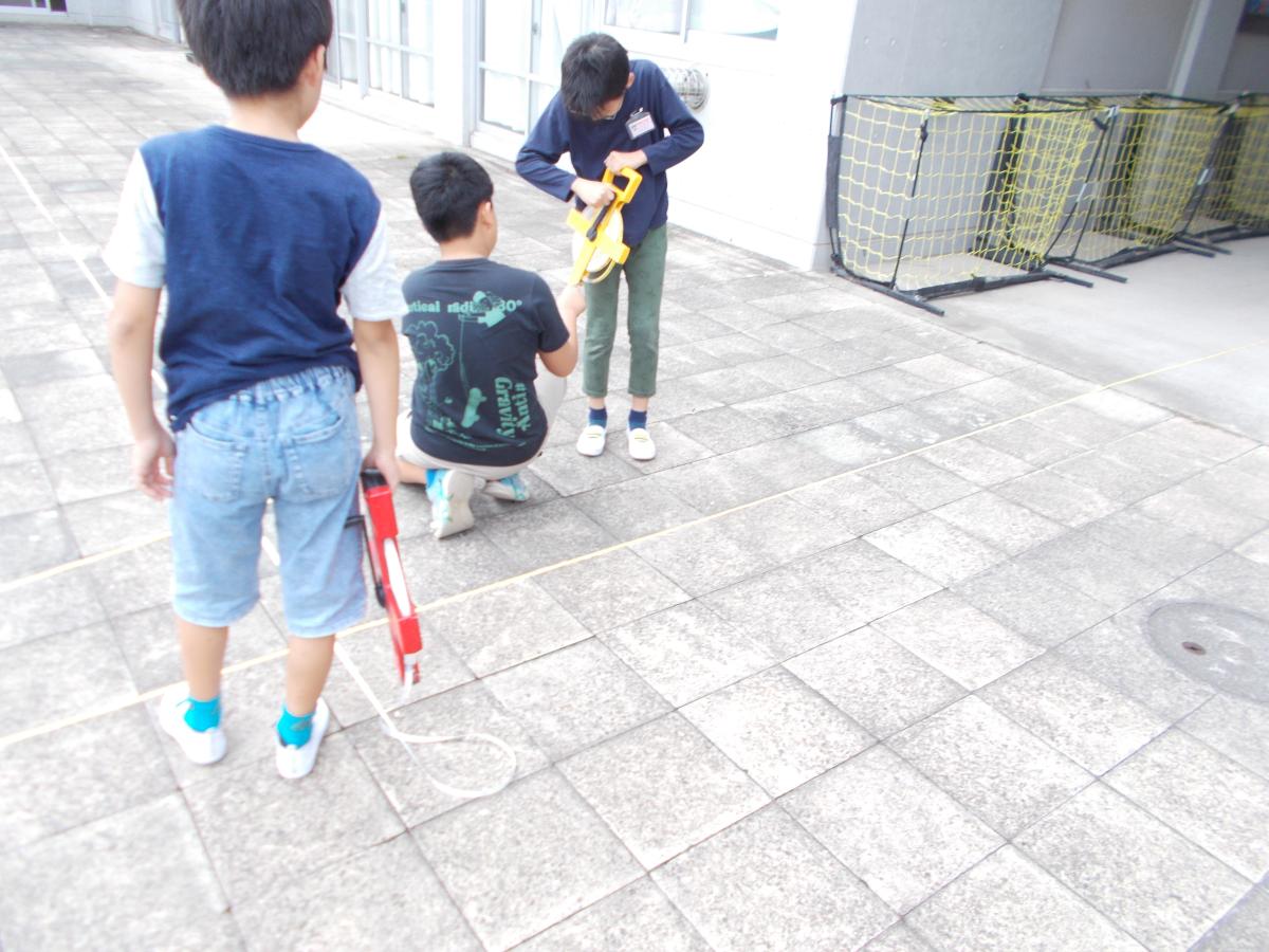 5年生の算数では平均を学習しています。今日は、教室や中庭などの長さを予想し、自分の10歩の歩幅の平均を使って予想した長さがどれくらい合っているのかを考えました。メジャーを使って実際の長さを測ってみたら、「1mくらいしかずれていなかった」などの声が聞こえてきました。自分の歩幅を知ることで、いつでもおよその距離を知ることができるようになりました。