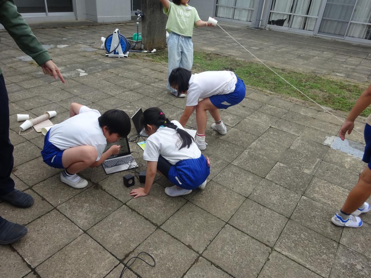 3年生の理科では、「音の性質」について学習が始まりました。子供たちが選んだ材料で糸電話を作り、マイクやスピーカーを使って、音の大きさがどのくらい伝わるのか実験を行いました。グループ内で役割を決めながら、協力して取り組む姿が見られました。