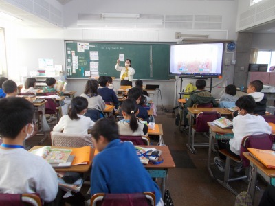 4年生の英語では、校内の好きな場所に案内したり紹介したりする活動を行っています。今日は、チャンツで図書室や体育館、校庭などの身近な場所に関する英語表現を練習しました。リズムに合わせて積極的に声を出して英語の音やイントネーションに慣れ親しみ、楽しく表現を身につけることができました。