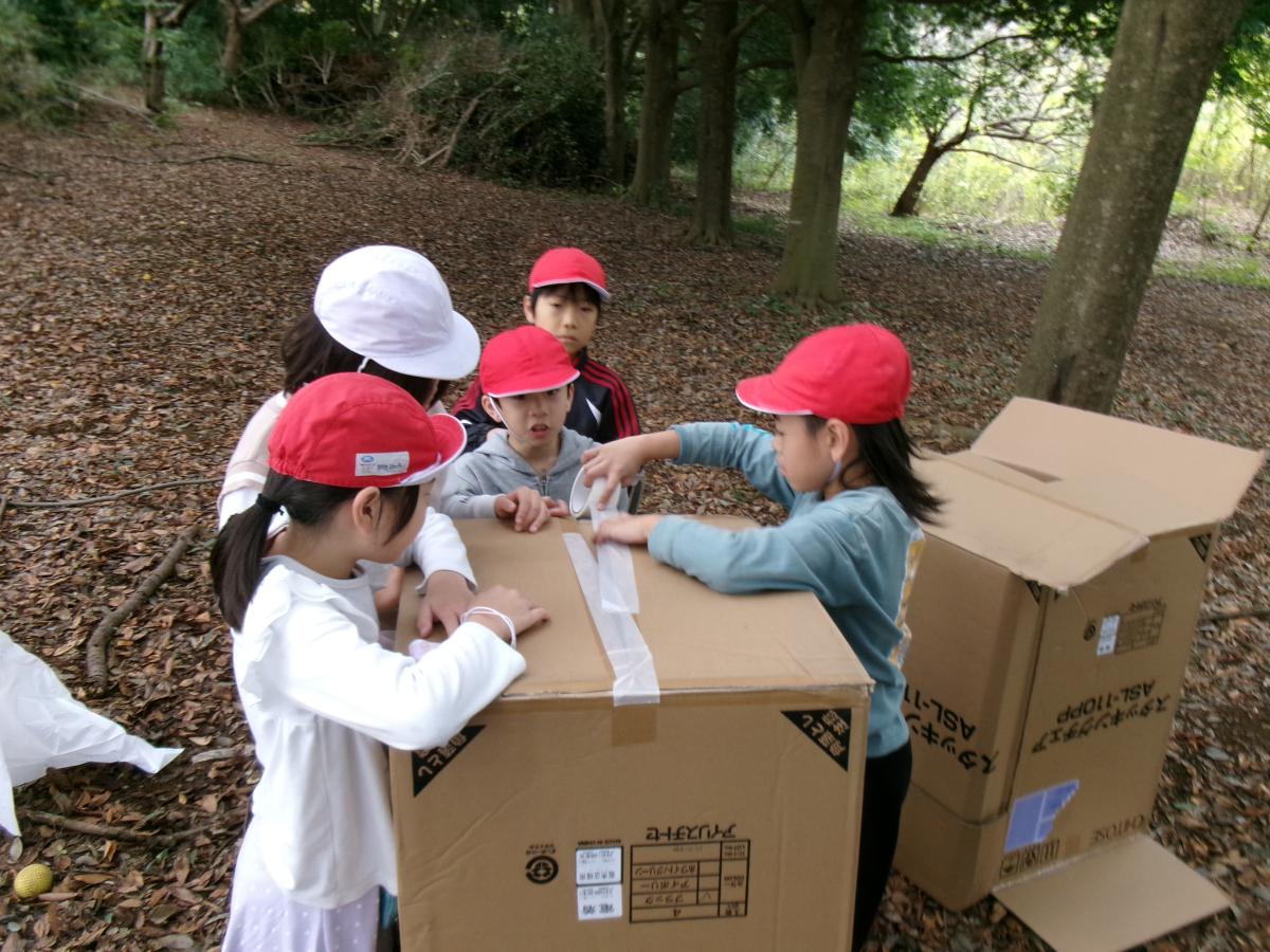 四年生の図工は教室を飛び出し、屋外で行いました。周辺に落ちている木や石などを使って、それぞれグループに分かれて作品づくりをしました。大きな作品を作ることや出来上がった作品を教室まで運ぶことを通して、友達と協力し合うことの大切さを学びました。自然が豊かな環境の中で授業するよさも知ることができました♪