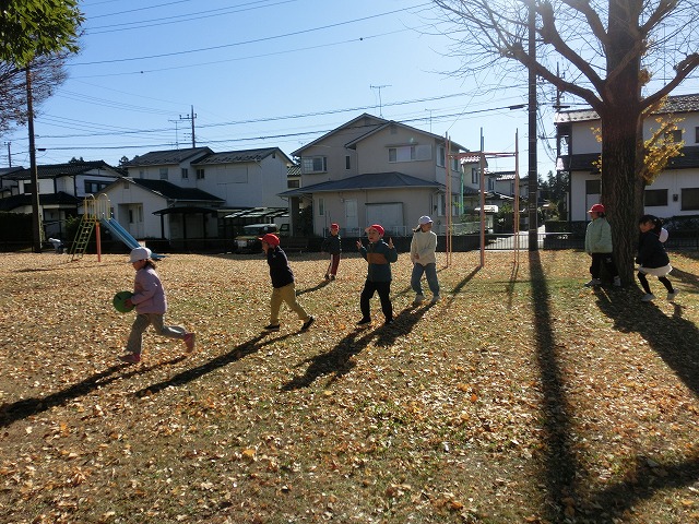 また、広い公園でかくれんぼや色おに、ボール遊びなどを楽しみました。冷たい北風がふいていましたが、子どもたちは元気いっぱい!秋から冬の公園たんけんを満喫していました。