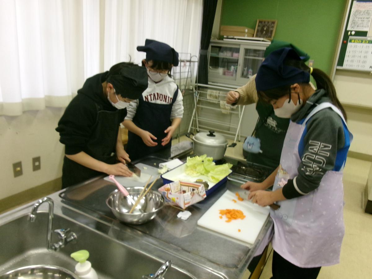 環境のことを考えながら「買い物」「調理」「食事」「片付け」をすることについて説明を受けた後、実演調理、調理実習と進み、子どもたちはとても楽しそうに参加していました。野菜を切ったり、使った道具を洗ったりと、班で協力して作った野菜スープはとても美味しかったようで、給食後の活動にもかかわらず、スープをきれいに完食していました。