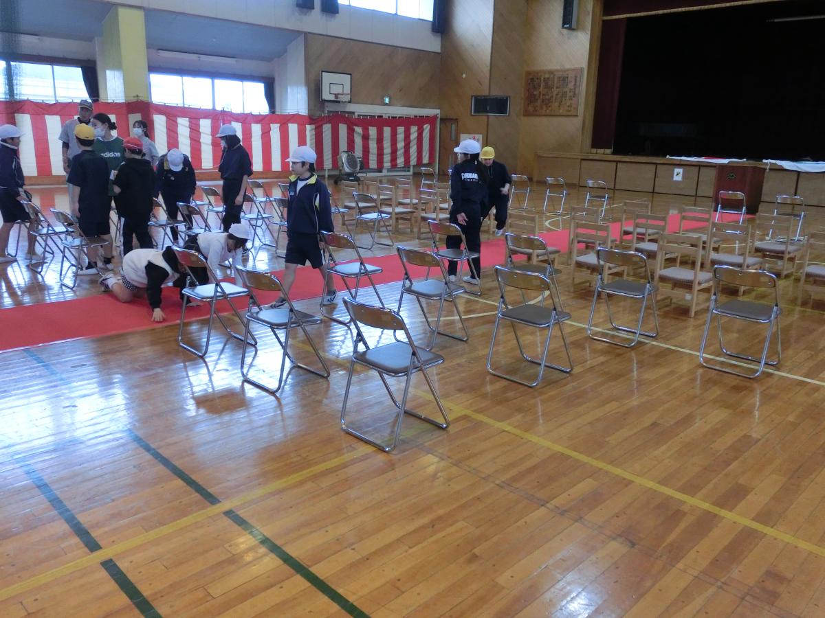 今日は5時間目に4、5年生を中心に体育館の花道や椅子ならべを行いました。紅白幕は幼稚園の先生にも手伝っていただき、着々と会場が整ってきました。来週には式典用のお花も届き、より本番に近い会場となっていきます。