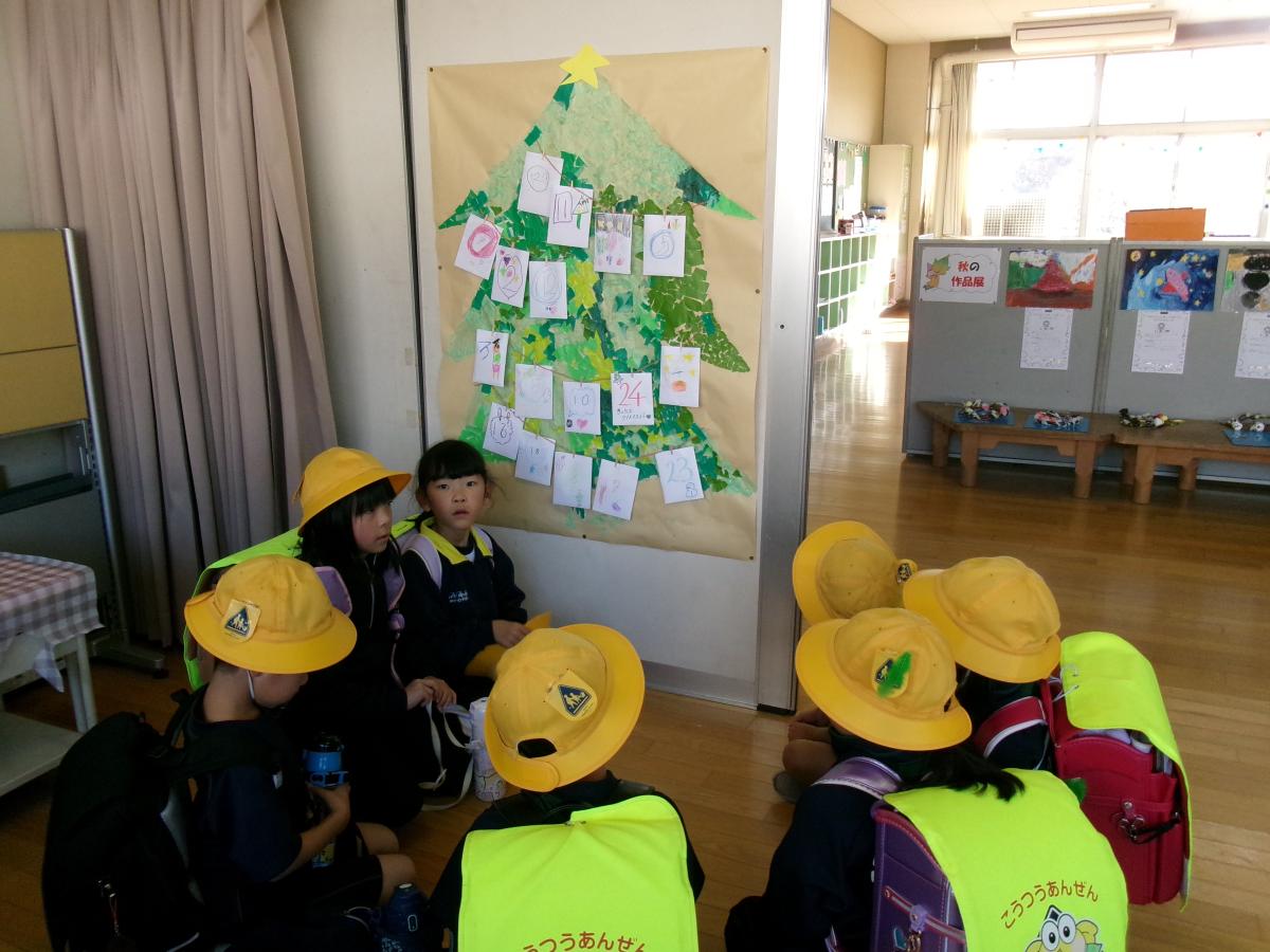 1年生の帰りの様子を覗いてみると…?なんだか楽しそうな声が聞こえてきます。1年生皆でクリスマスまでのアドベントカレンダーを作ったようです。今日は1日なので、「1」のカードを開封しました。「皆とハイタッチをしてから帰ろう!」と書かれていたので、楽しそうにハイタッチをしてから下校していました。明日の内容も気になります!