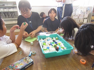 「理科で育てたヘチマの葉を使って紙を作れないかな?」「ペットボトルキャップでどんな工作ができるだろう?」「オリジナル環境かるたを作ってみんなに伝えたらどう?」など、みんなで出したアイデアを実現するために、計画書に沿って準備をしたり、試作をしたりしていました。