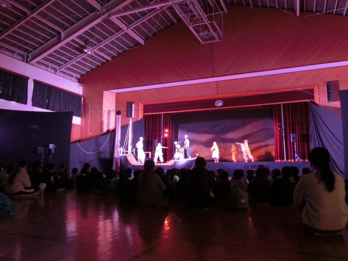今日は体育館が劇場に変身!劇団ポプラのみなさんをお招きし、「シンドバッドの大冒険」のミュージカルを鑑賞しました。